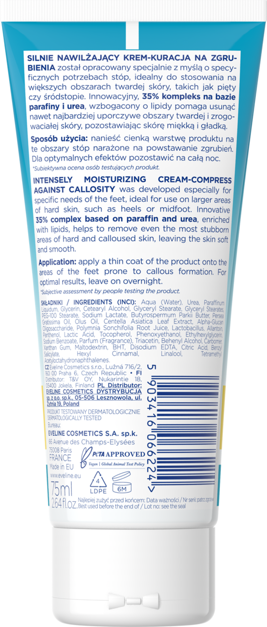 Apply a small amount of the cream to clean, dry feet, focusing on areas prone to calluses such as the heels and metatarsals. Massage gently until absorbed. For an intensive treatment effect, apply a thicker layer, put on cotton socks, and leave on overnight. Use regularly to maintain smooth, soft skin.
