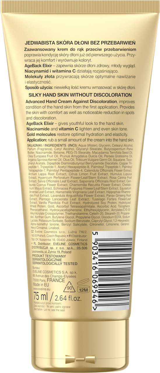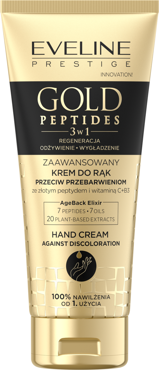 - Experience the targeted action of Eveline's Gold Peptides 3in1 Hand Cream, an advanced anti-discoloration treatment. This formula, enriched with gold peptides, vitamin C, and B3, visibly reduces age spots and restores youthful radiance.