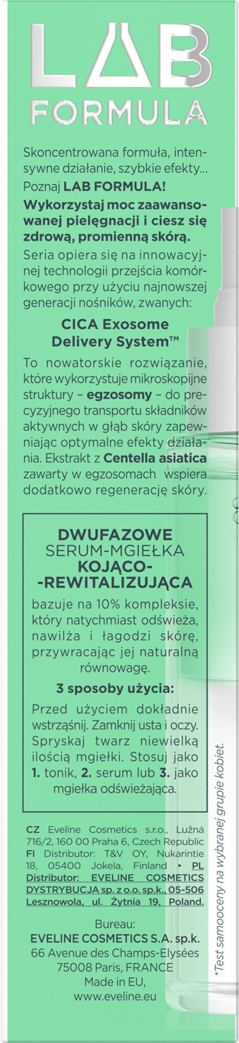 - Lab Formula is a two-phase serum-mist that instantly restores skin's freshness, hydration, and healthy glow. It acts as an instant energy boost – soothing, nourishing, and supporting natural regeneration from the very first application.