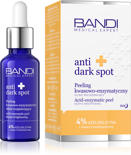 - Gently exfoliating and brightening discoloration Bandi peeling (darker skin color on the cheeks, forehead, upper lip, chin). The cosmetic works on fresh post-acne discolorations, contains tranexamic acid, azeloglycine, which evens out the skin tone.