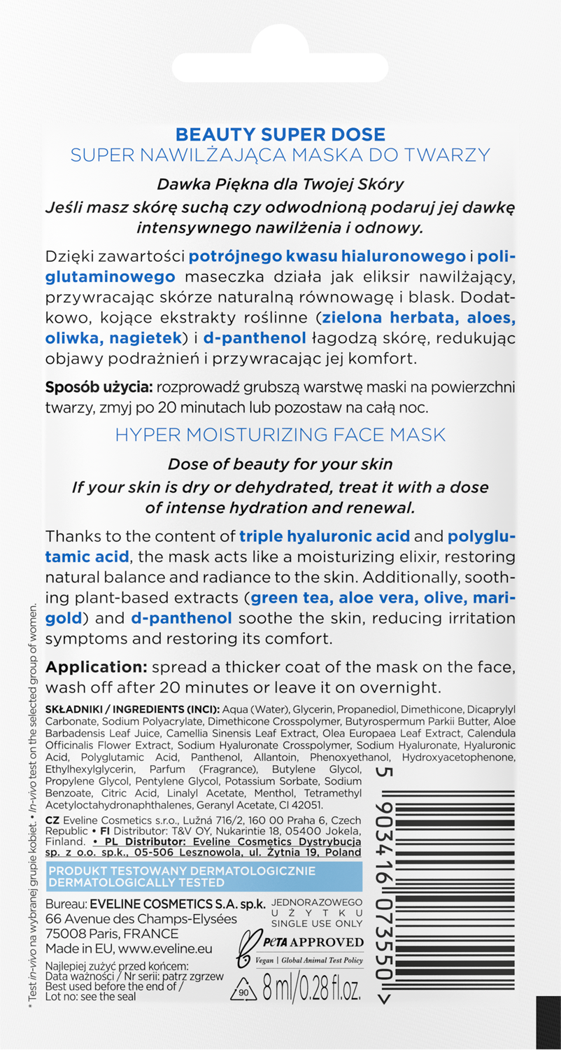 Does your skin feel tight, look dull, or show signs of dehydration? These are clear indicators that your skin's moisture barrier requires an immediate, targeted intervention. The Eveline Beauty Super Dose mask is a testament to Polish cosmetic innovation, delivering a concentrated dose of hydration to restore comfort and radiance to dry, compromised skin. This hydrating face mask with hyaluronic acid is your professional solution for a quenched, luminous complexion.