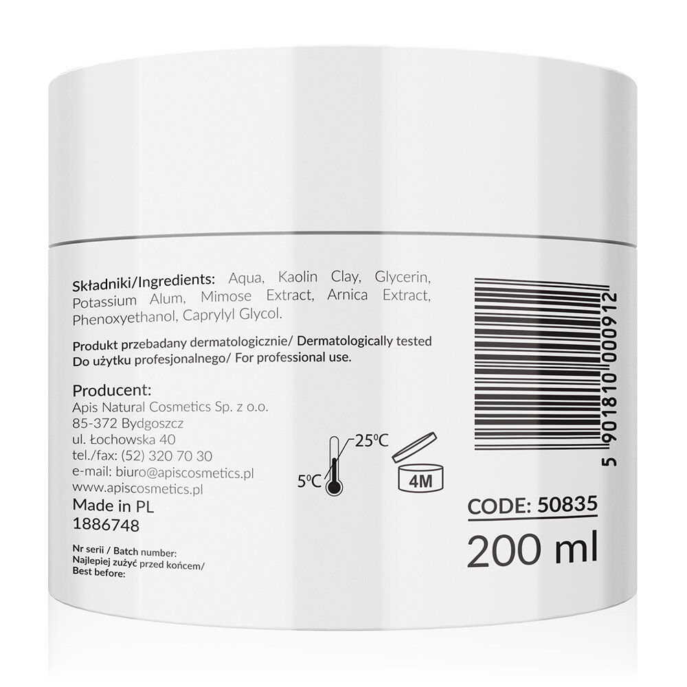 - Calm and rejuvenate your skin post-treatment with Apis Professional's soothing mask, enriched with kaolin, mimosa, and arnica extracts, for a refreshed, radiant complexion.