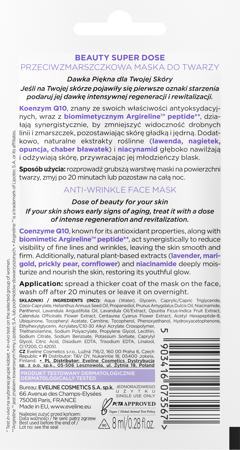 Addressing the first signs of aging, such as a loss of firmness and the appearance of fine lines, requires a targeted, powerful solution. The Eveline Beauty Super Dose Anti-Wrinkle Face Mask is an advanced formulation from Poland, delivering a concentrated dose of active ingredients precisely where your skin needs it most. This is your professional response to the skin's evolving needs.