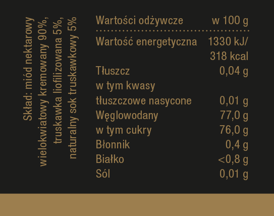 Natural creamed multifloral nectar honey 90%, freeze-dried strawberries 5%, natural strawberry juice 5%.