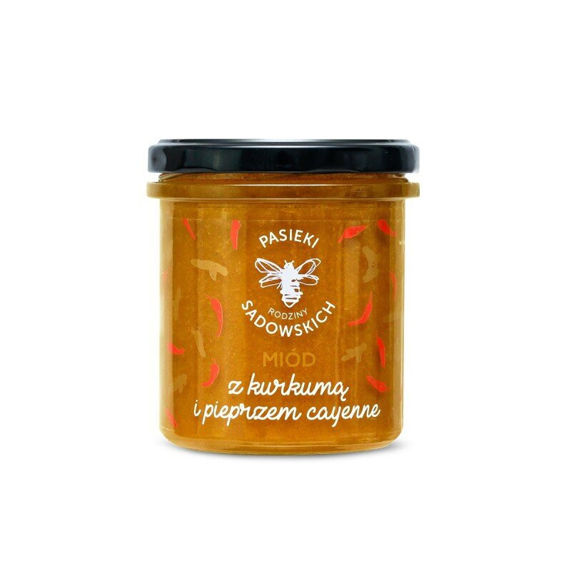 Multifloral nectar honey with 3% turmeric and 1% cayenne pepper. Warming, beautifully golden honey - an ideal proposition for fans of unusual flavor combinations. The sweetness of creamy multifloral honey is perfectly balanced with the sharpness of cayenne pepper, and a pinch of turmeric adds an oriental flavor.