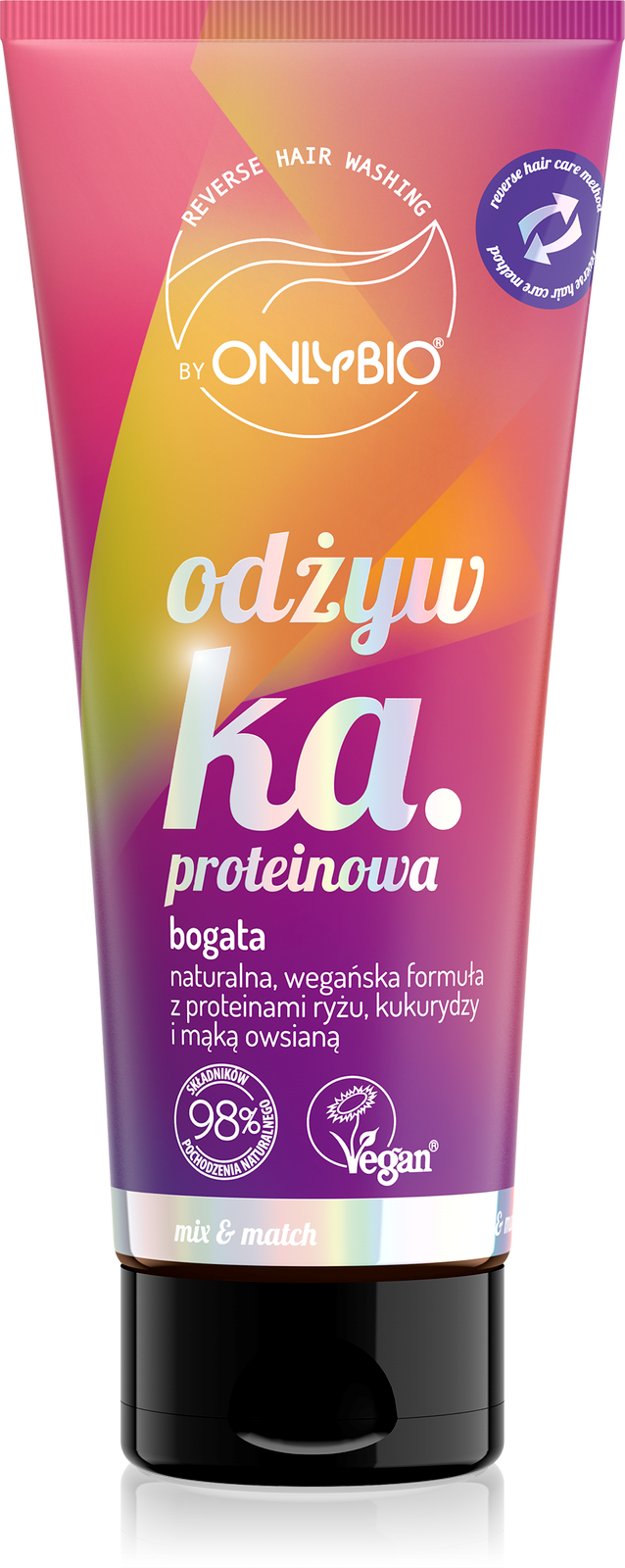 - Vegan protein conditioner from the Reverse hair washing series from Onlybio contains as much as 98% ingredients of natural origin, caring for the appearance and condition of the strands. Among them were rice protein, corn and oatmeal.