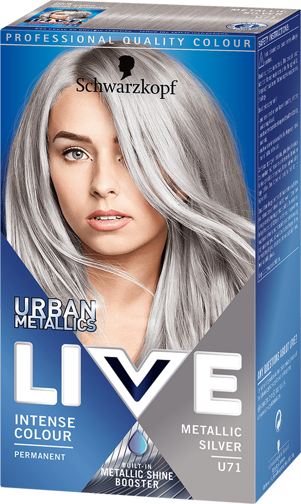 Schwarzkopf Live Intense Color Urban Metallics - The joy of color! Create metallic shades with an intense and vivid color and an integrated metallic gloss enhancer. For maximum color depth and a metallic shine. Integrated metallic gloss enhancer. Contains coconut oil. It gives the hair a brilliant shine and an iridescent metallic finish.
