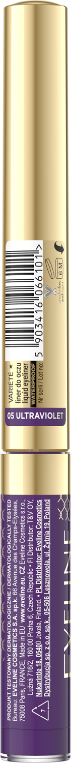 - Define your eyes with the artistic precision of Eveline Variete Colored Eyeliner in Ultraviolet. This vegan, waterproof formula delivers a bold, semi-matte finish that lasts up to 24 hours without smudging.