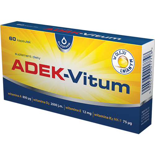 - Adek-Vitum is a complex of vitamins A, D, E, and K2 in flaxseed oil, designed for adults. It helps supplement the diet with key fat-soluble vitamins, supporting the body's proper functioning and overall well-being.