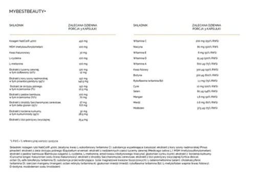 NatiCol® 4000 fish collagen, gelatin, L-ascorbic acid (vitamin C), bulking agent (cellulose), maritime pine bark extract (Pinus pinaster), horsetail herb extract (Equisetum arvense), alfalfa (Medicago sativa L.) aerial parts extract, MSM (methylsulfonylmethane), bamboo shoot extract (Bambusa vulgaris), L-cysteine, L-methionine, nicotinamide (niacin), zinc gluconate (zinc), turmeric root extract (Curcuma longa), sodium hyaluronate (hyaluronic acid), Saccharomyces cerevisiae yeast extract, nettle leaf extract (Urtica dioica), DL-alpha tocopheryl acetate (vitamin E). anti-caking agent (magnesium salts of fatty acids), L-selenomethionine (selenium), cholecalciferol (vitamin D), manganese sulfate (manganese), retinyl acetate (vitamin A), copper gluconate (copper), riboflavin (vitamin B2), calcium L-methylfolate (folic acid), D-biotin, sodium molybdate (molybdenum).