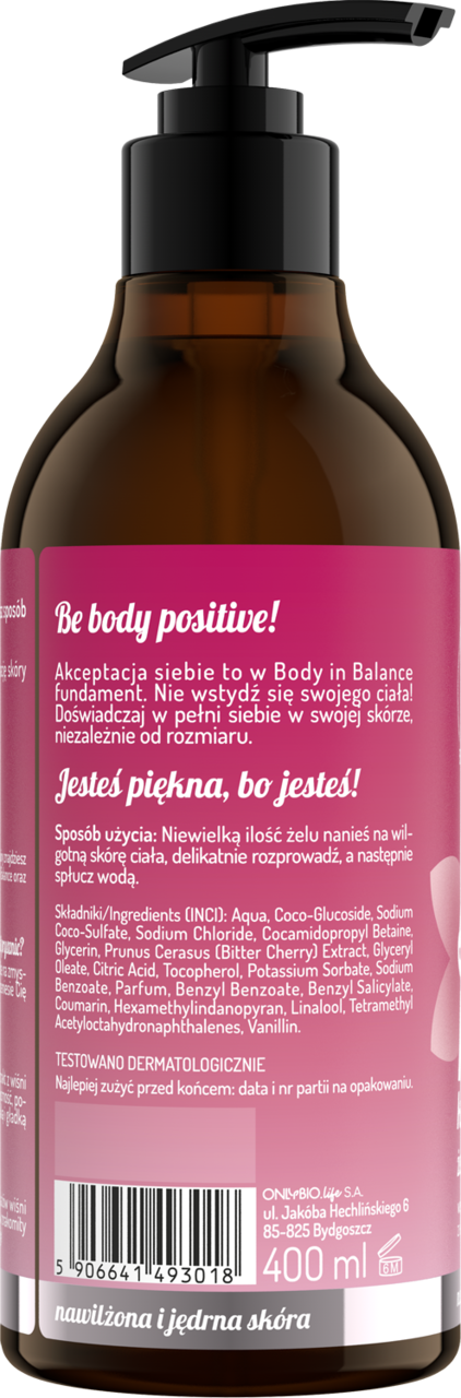 - Żel pod prysznic OnlyBio Body in Balance z ekstraktem z kwiatu wiśni intensywnie nawilża i ujędrnia skórę. Wegańska formuła, oparta w 96% na składnikach naturalnych, zapewnia profesjonalną pielęgnację w domowym SPA.