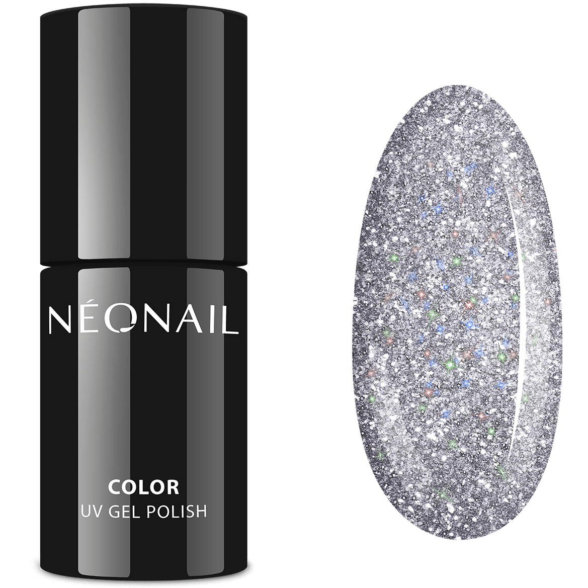 Odcień Dazzling Diamond, czyli srebrny brokat, który został zatopiony w półtransparentnym lakierze w towarzystwie multikolorowych drobinek i opalizującego pyłku.