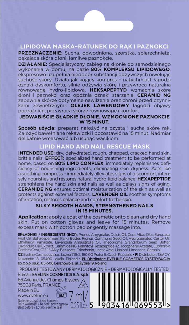 Twoje dłonie są narażone na codzienne wyzwania, co prowadzi do ich przesuszenia, szorstkości i pękania. Eveline Lipidowa Maska-Ratunek to profesjonalna odpowiedź na potrzeby wymagającej skóry. Działa jak specjalistyczny zabieg-kompres, który przynosi natychmiastową ulgę i intensywnie regeneruje. Ta kojąca maska do rąk z lipidami to skoncentrowana formuła, która przywraca dłoniom zdrowy wygląd, gładkość i komfort.