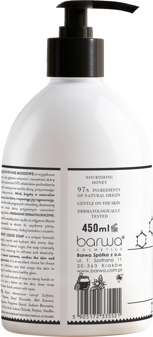 - Oparte na 97% składników naturalnych, odżywcze mydło w płynie z miodem, które intensywnie nawilża i regeneruje suchą skórę, przywracając jej komfort i elastyczność.