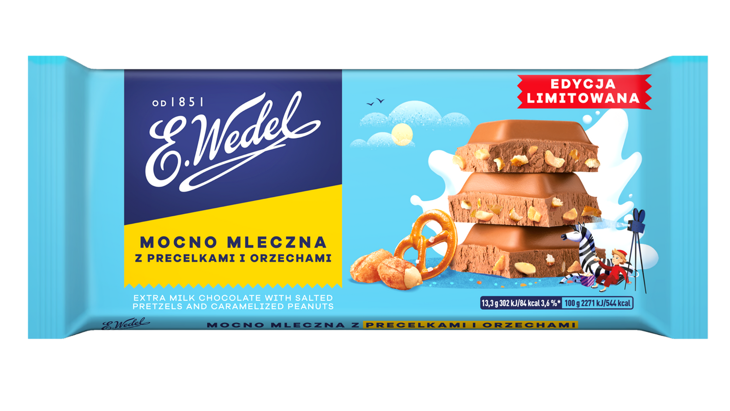 - Rozpływająca się w ustach, wedlowska czekolada mocno mleczna połączona z dodatkiem słonych precelków i karmelizowanych orzeszków ziemnych.To wyjątkowa kombinacja smaków słodkiego i słonego, które wzajemnie się uzupełniają.