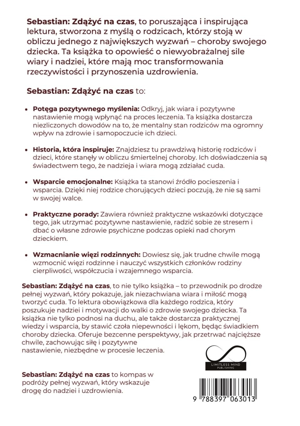 Sebastian: Zdążyć na czas, to poruszająca i inspirująca lektura, stworzona z myślą o rodzicach, którzy stoją w obliczu jednego z największych wyzwań - choroby swojego dziecka. Ta książka to opowieść o niewyobrażalnej sile wiary i nadziei, które mają moc transformowania rzeczywistości i przynoszenia uzdrowienia.