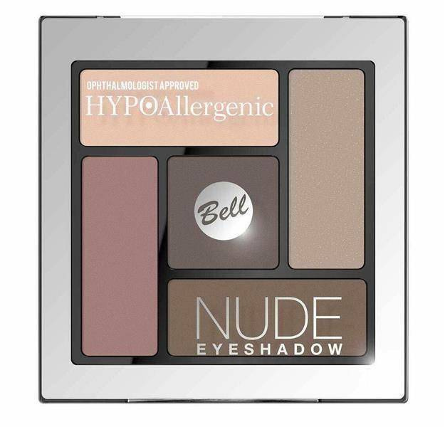 - Nude Eyeshadow to paleta pięciu cieni do powiek z serii hypoalergicznej stworzona przez markę Bell. Produkt może być stosowany również przez osoby z wrażliwymi oczami. Cienie posiadają delikatną, kremową konsystencję.