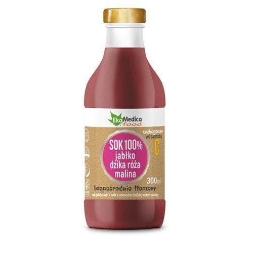 Sok jabłkowy bezpośrednio tłoczony z dodatkiem soku z owoców dzikiej róży i maliny, wzbogacony witaminą C. Wyprodukowany częściowo z soków zagęszczonych. Naturalnie mętny. Pasteryzowany.