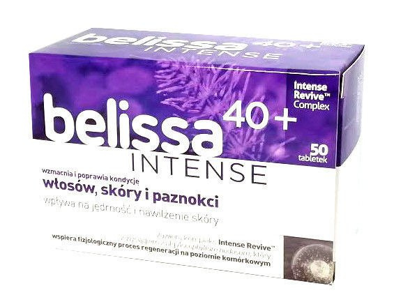 - Belissa Intense 40+ to suplement diety stworzony z myślą o kobietach po 40. roku życia. Zawiera starannie dobrane składniki, które pomagają w utrzymaniu zdrowego wyglądu włosów, skóry i paznokci, wspierając ich naturalną kondycję od wewnątrz.