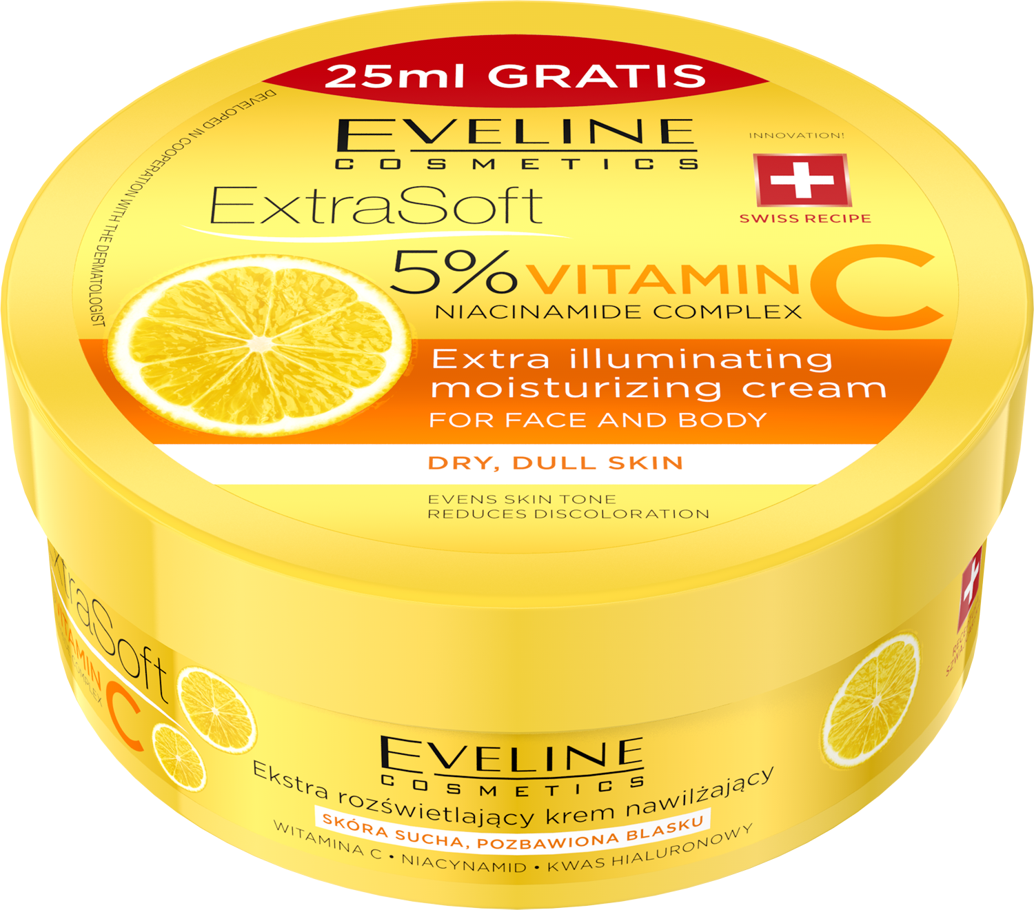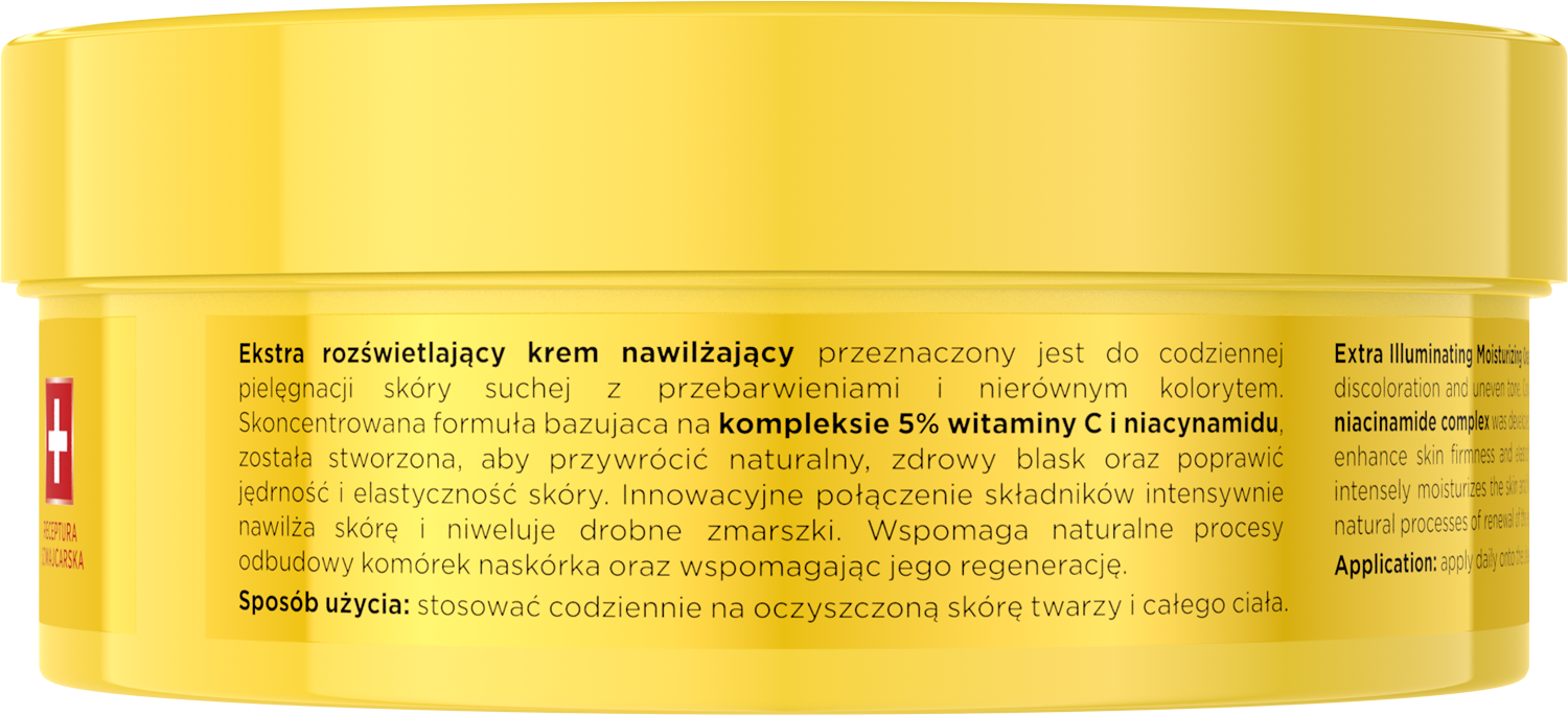 - Profesjonalna formuła dla skóry suchej i z przebarwieniami. Ten ekstra rozświetlający krem nawilżający z 5% kompleksem witaminy C i niacynamidu przywraca jednolity koloryt i zdrowy blask.