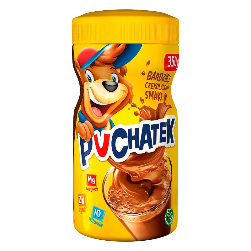 Napój kakaowy Puchatek jest dedykowany dzieciom, jednak ma tak pyszny smak, że chętnie sięgają po niego także dorośli. Idealnie współgra ze śniadaniem dodając energii na cały dzień. Dodatkowo zawiera zestaw 10 witamin oraz wapń.