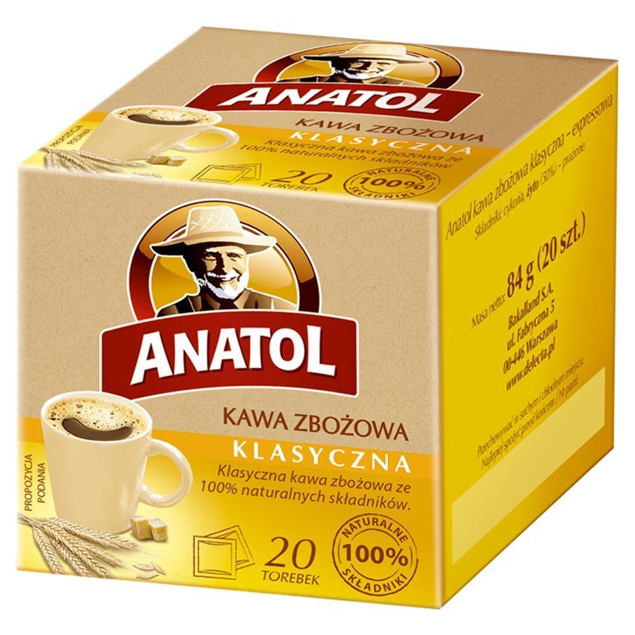 - Kawa zbożowa Anatol powstaje z cykorii i starannie wybranych ziaren polskich zbóż, które w unikalnym procesie palenia nabierają niezwykłej mocy i smaku. Nie zawiera kofeiny.